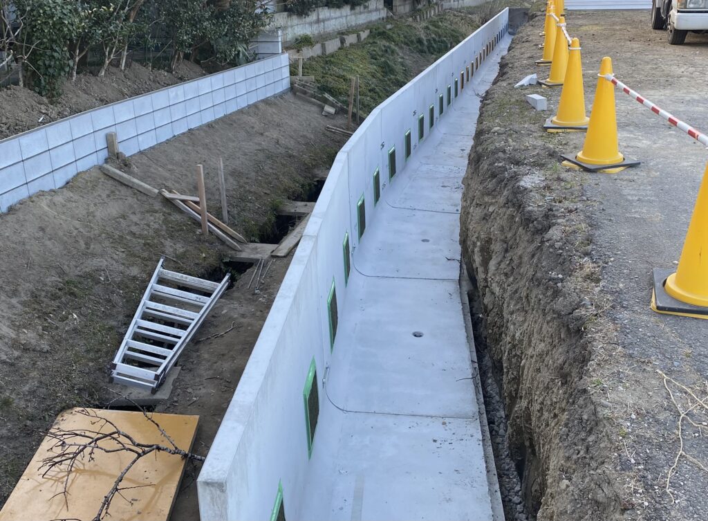 L型擁壁を設置し、土留め構造が完成した状態です。