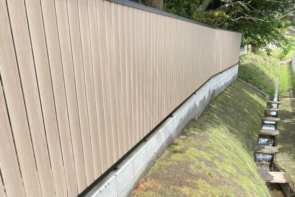 L型擁壁のある水路を挟んだ反対側(施主様のご自宅側)に、コンクリートブロックと木調フェンスを設置しました。