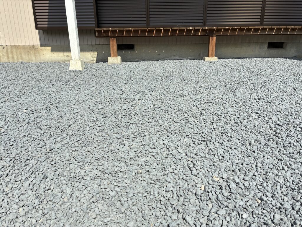 防草シート上に砕石を均一に敷均し、最終整地をしました。
