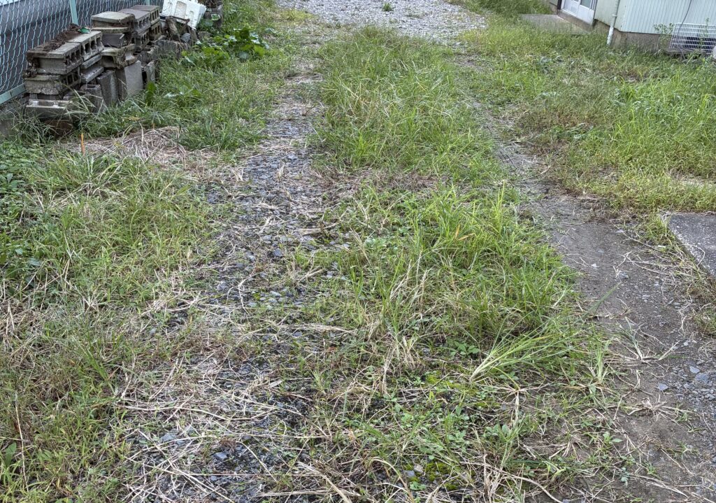 車が通ることから高耐久の防草シートを前面に敷設しました。